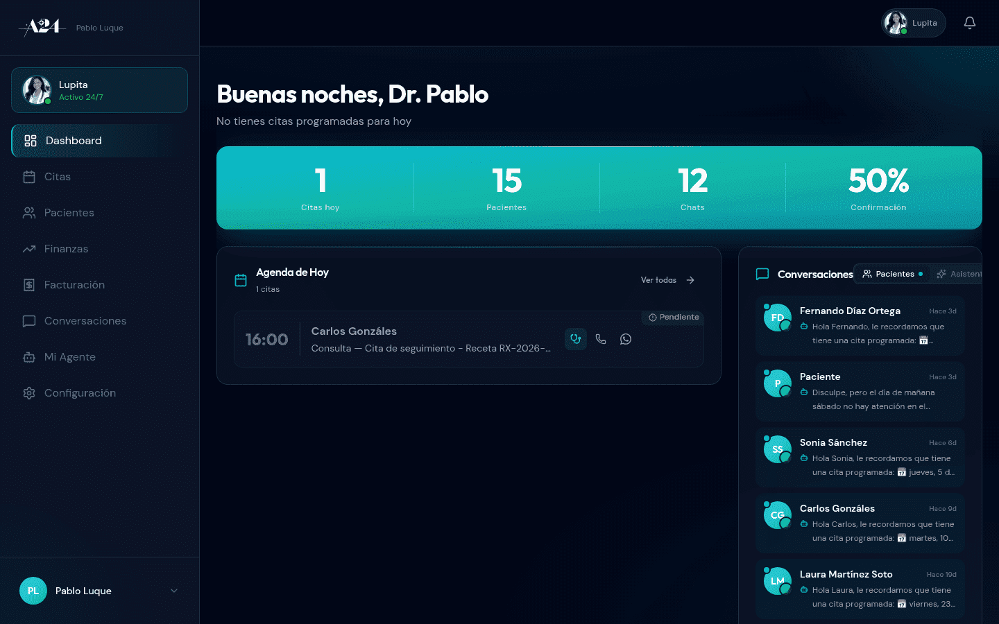 Un asistente virtual disponible 24/7 que atiende WhatsApp y llamadas telefónicas. Responde preguntas, agenda citas, envía recordatorios y gestiona la comunicación con tus pacientes de manera natural e inteligente.